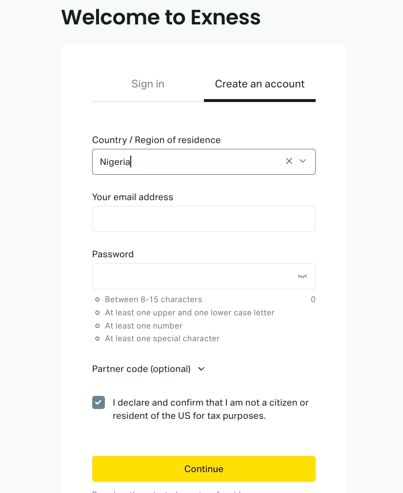 Registration form required us to fill in our country of residence and email address and choose a password. This allowed us access to Exness Personal Area.